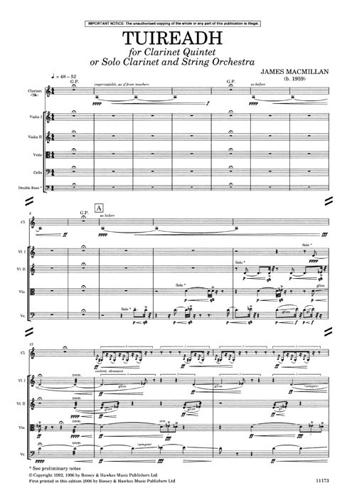 This score is suitable for both versions of the work (clarinet quintet or solo clarinet & string orchestra). Tuireadh is Gaelic for a lament (or requiem) for the dead. This work is dedicated to the victims of the Piper Alpha disaster & their families.